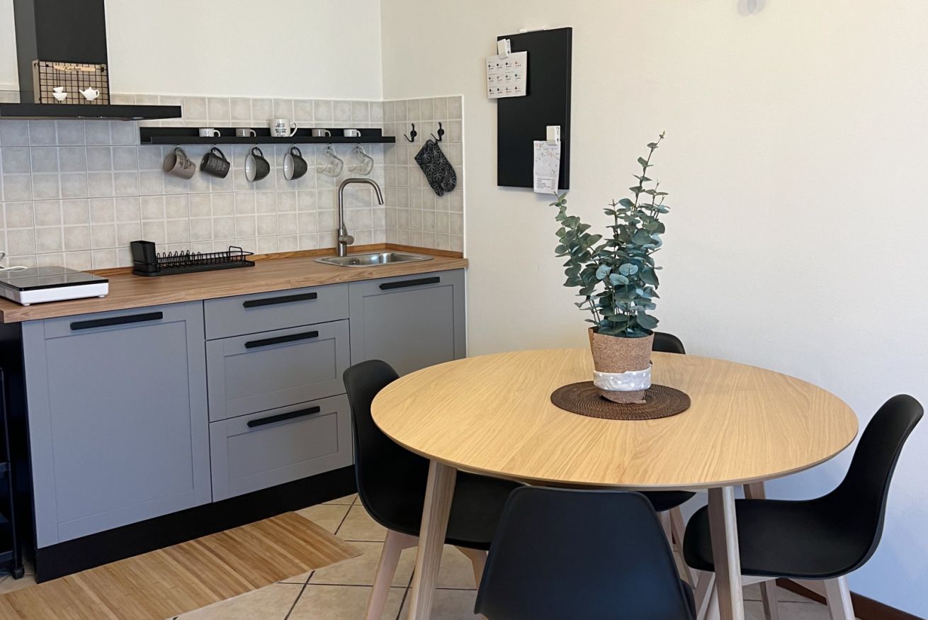 L'ingresso è nella zona giorno dove si trova il divano a tre posti con televisione a schermo piatto, la cucina dotata di macchinetta del caffè Nespresso, bollitore, utensili per cucinare, fornelli a induzione ed il tavolo da pranzo per 4 persone.