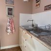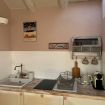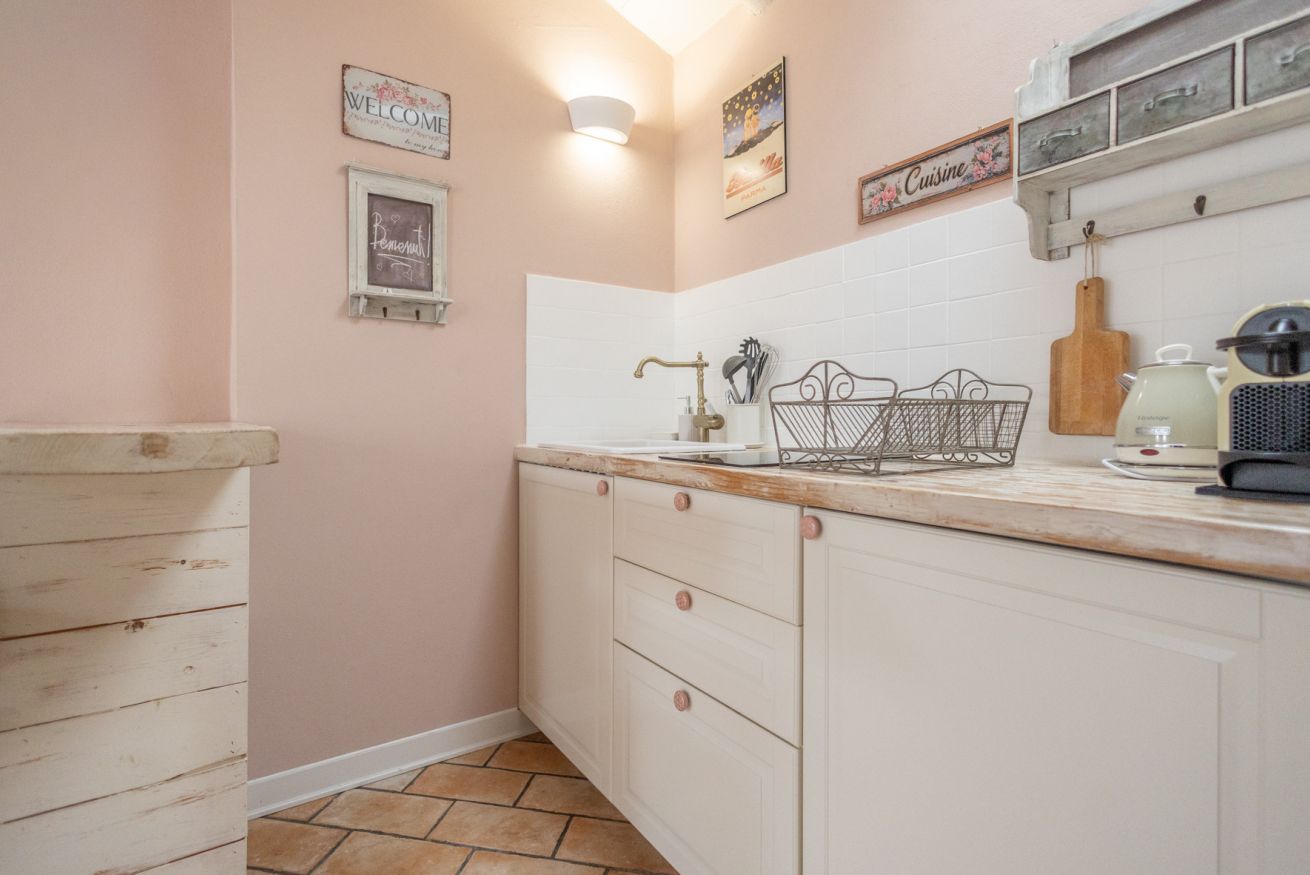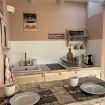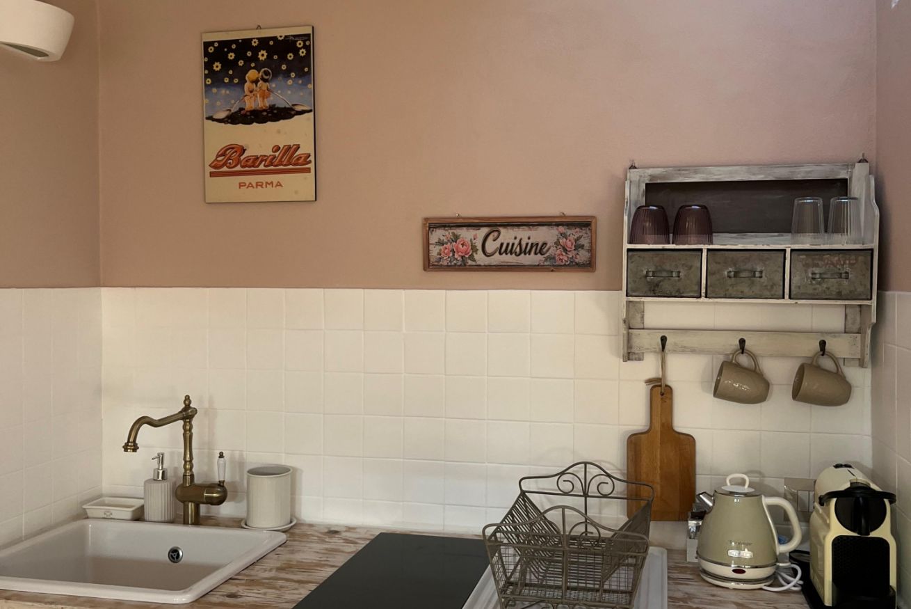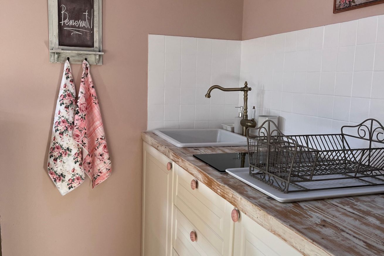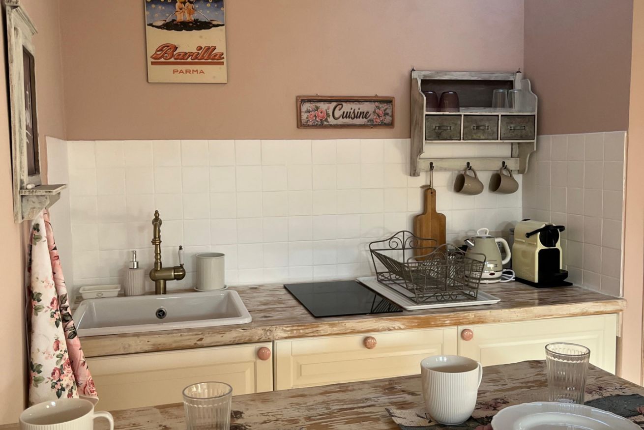 Cucina attrezzata con bollitore, fornelli induzione, macchinetta del caffè con cialde pentole e utensili per cucinare e tanto altro, letto matrimoniale con cassetti e angolo armadio con grucce e stirella.