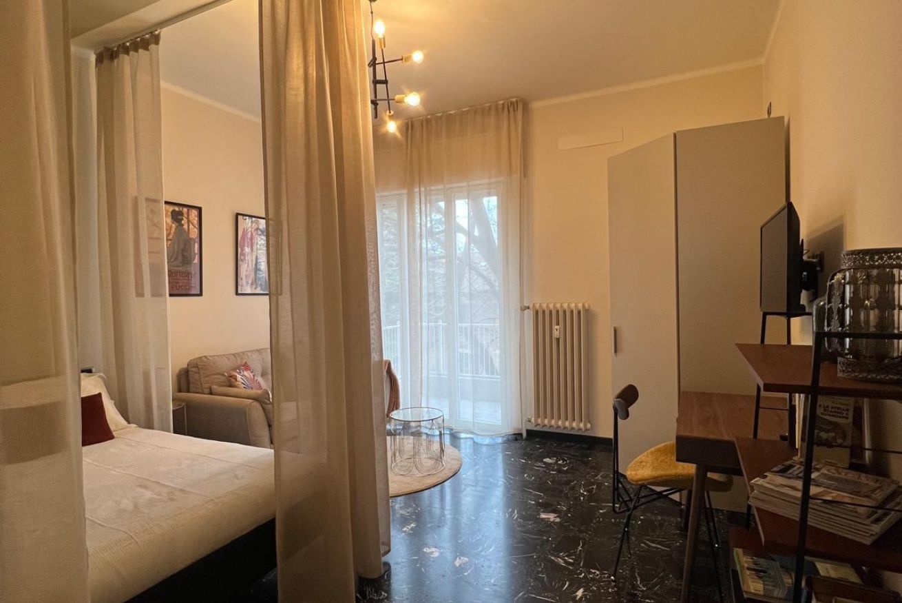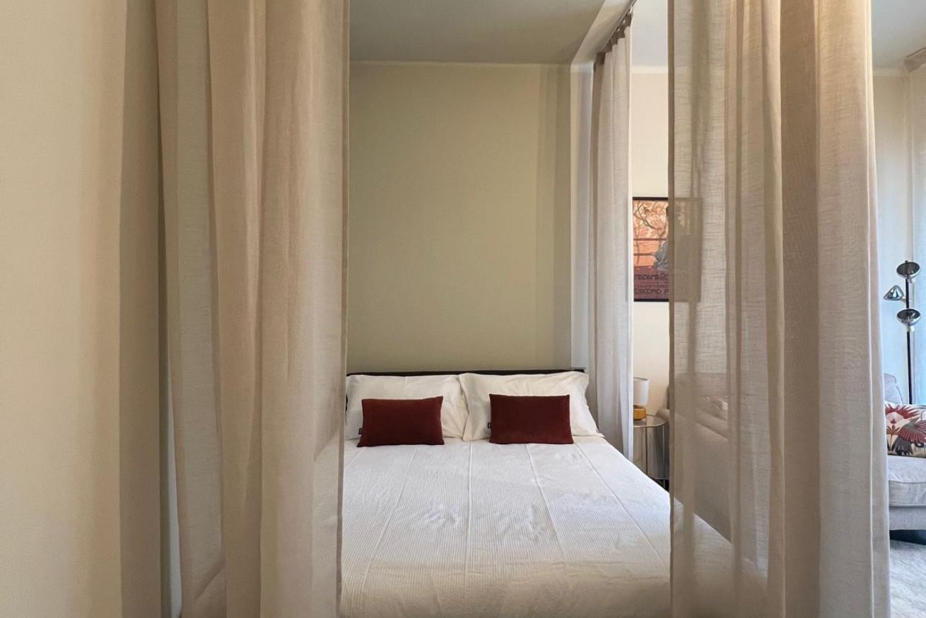 Si passa poi alla camera da letto, ampia, luminosa e confortevole nella quale si trovano un angolo salotto con divano e smart tv, l'armadio dotato di grucce e stirella, un angolo lavoro con scrivania ed infine il comodo letto matrimoniale circondato da morbide tende.