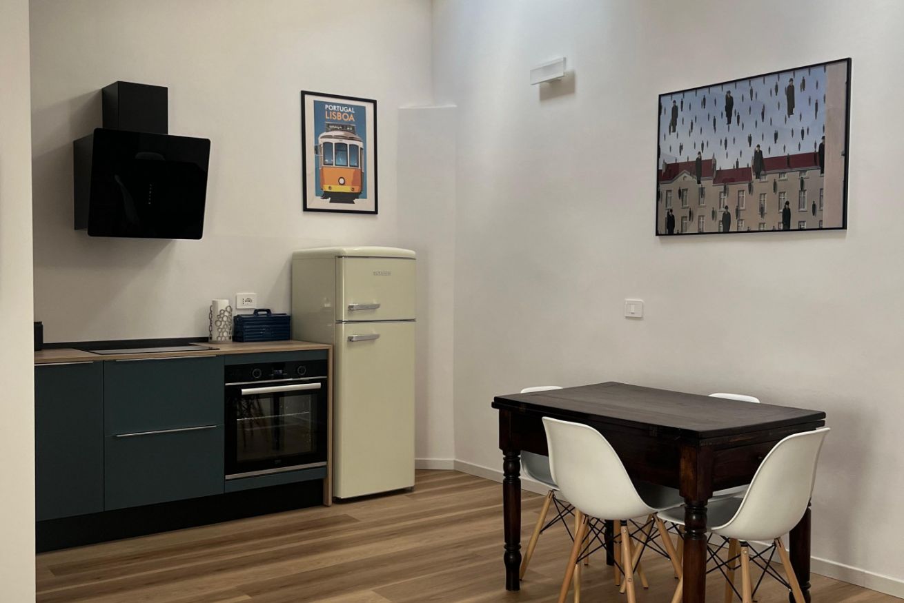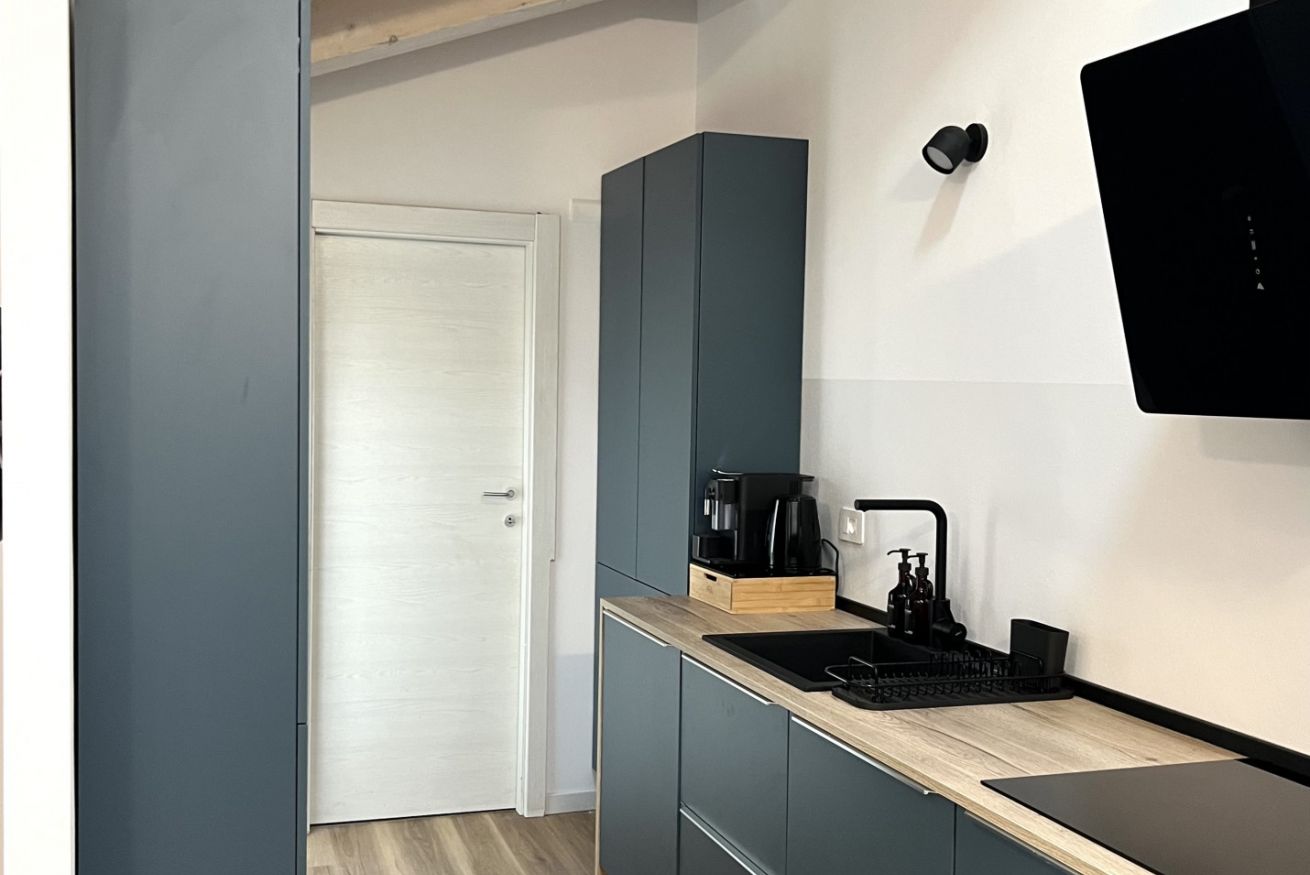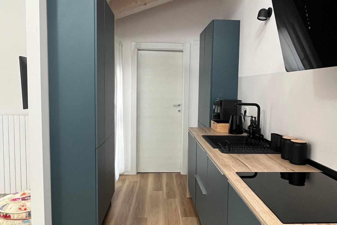 La cucina è interamente attrezzata con: forno, piano ad induzione, macchinetta del caffè con cialde Nespresso, bollitore, lavastoviglie e utensili per cucinare, da qui si può passare al balconcino.