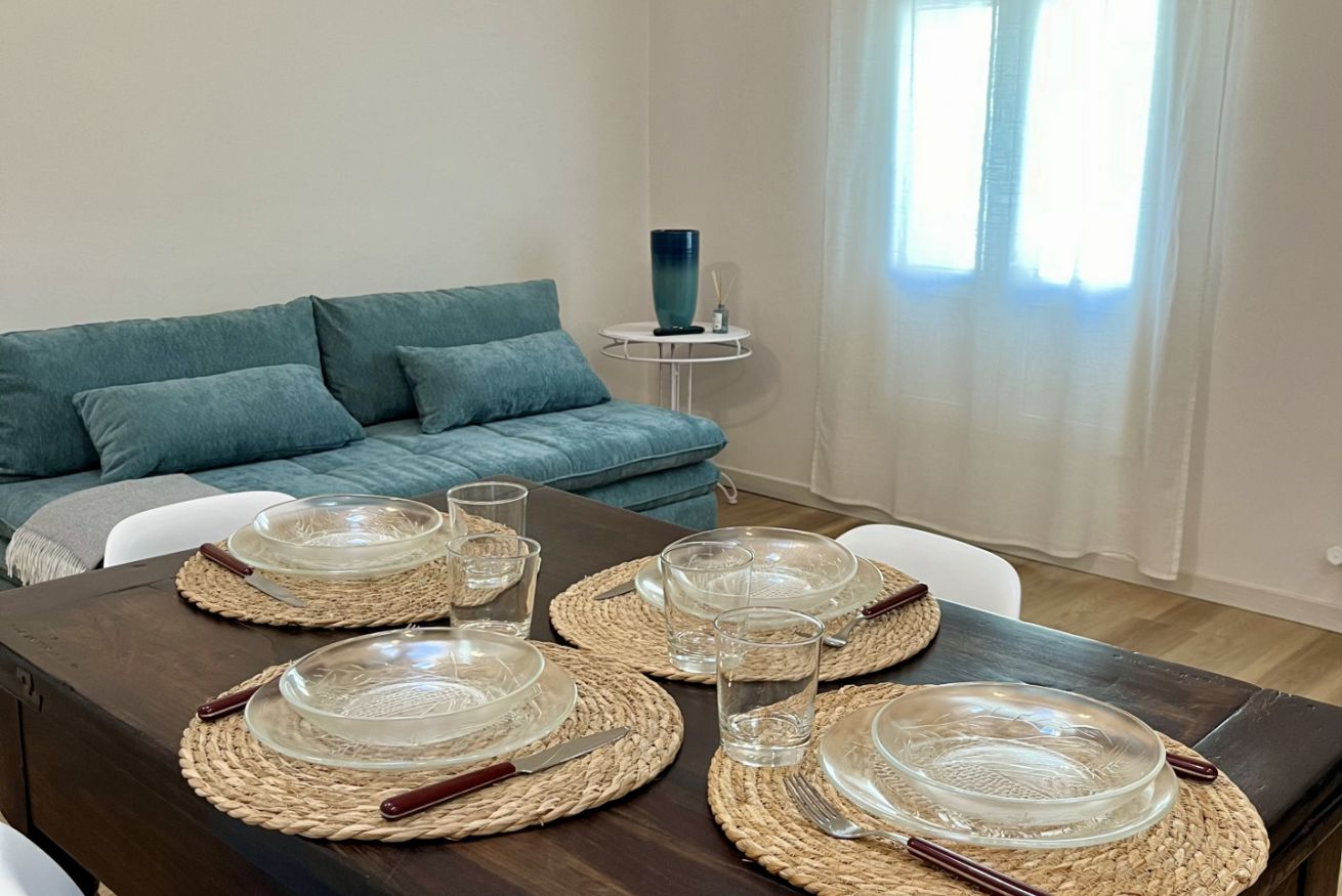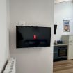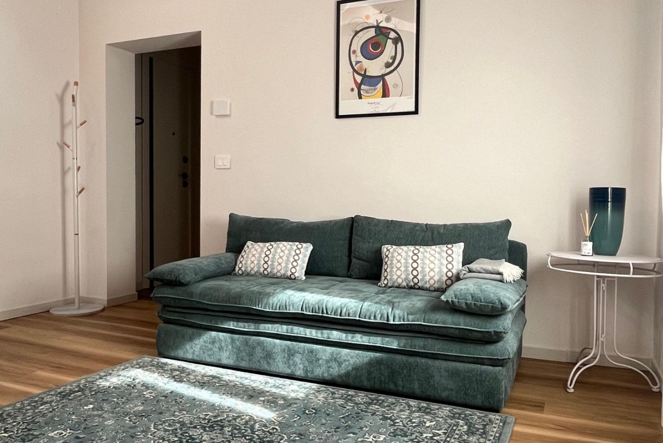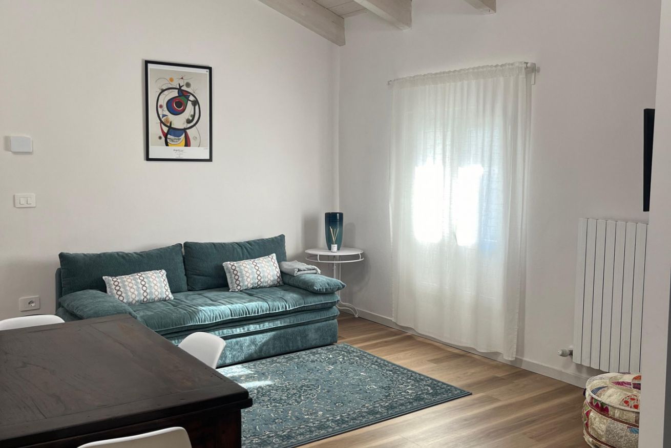 Proseguendo si accede alla zona giorno, qui si trovano il divano che in caso di bisogno diventa letto e Smart TV.