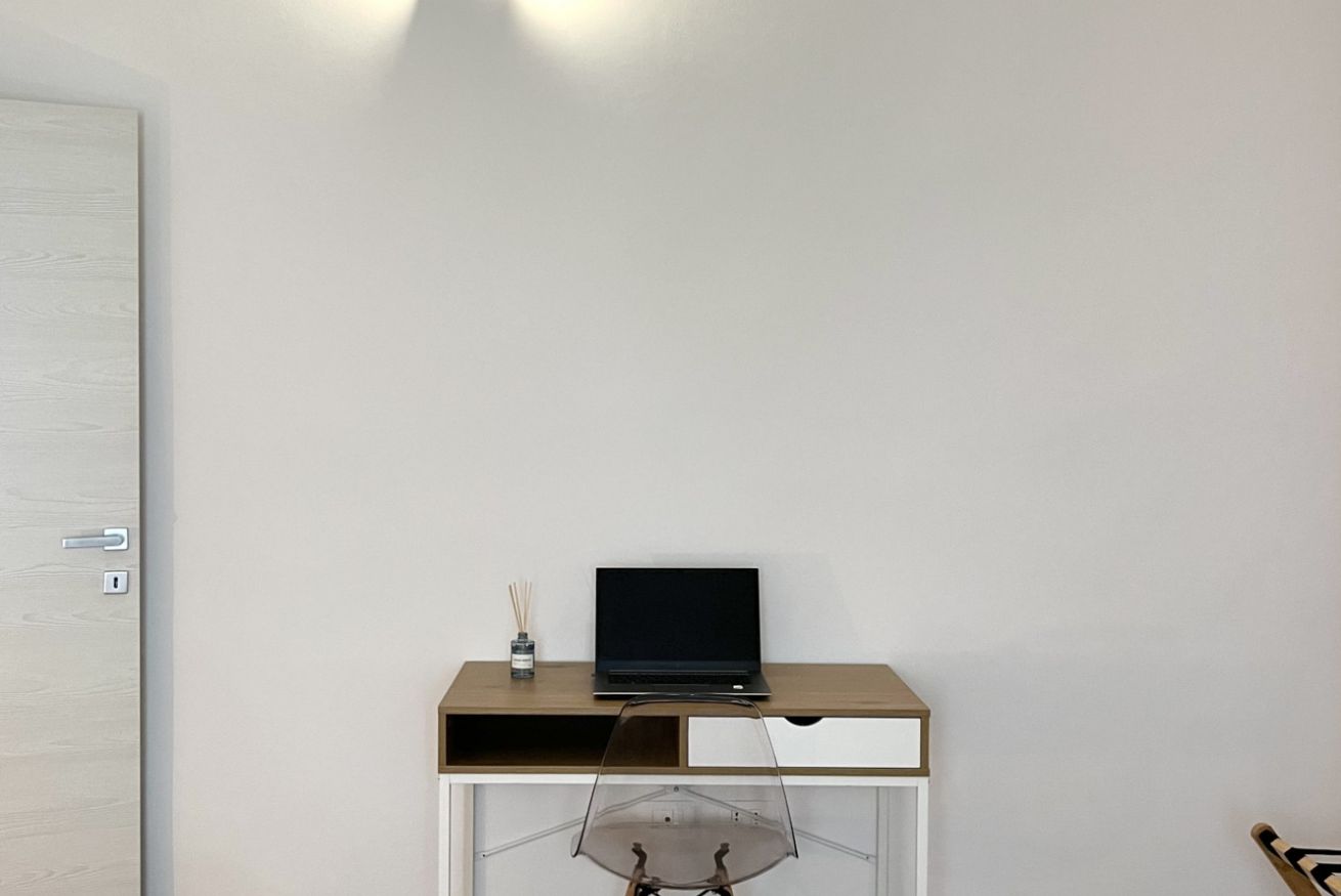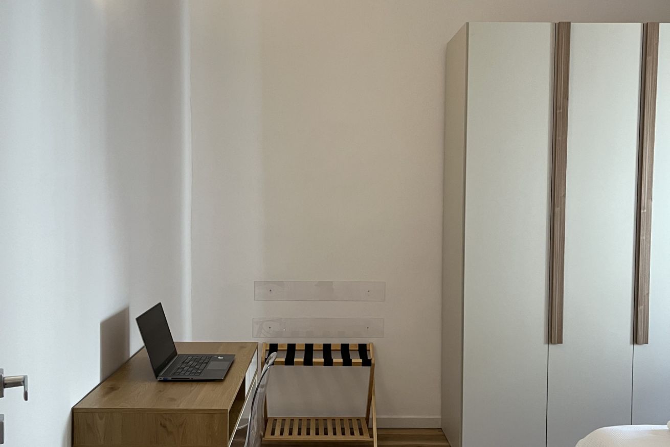 La spaziosa camera matrimoniale è dotata di un armadio con all'interno grucce e stirella, inoltre offre anche un porta valigie e uno spazio da lavoro con scrivania.